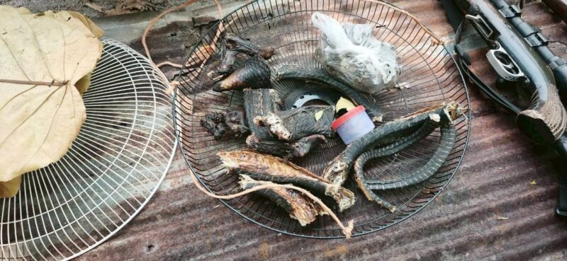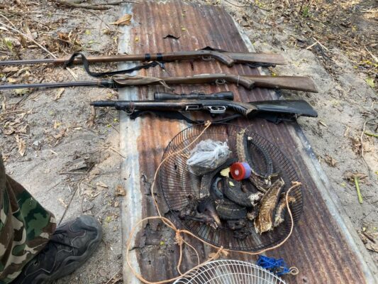 จากการตรวจค้นโดยรอบ พบอาวุธปืนแก๊ปไทยประดิษฐ์ 3 กระบอก (หนึ่งในนั้นดัดแปลงติดลำกล้องส่องสัตว์) ซุกซ่อนตามกิ่งไม้และใช้สังกะสีปิดทับ นอกจากนี้ยังพบซากสัตว์ป่าจำนวนมาก ประกอบด้วย ซากตัวนิ่ม 5 ชิ้น, ซากงูเห่า 8 ชิ้น, หัวอีเห็น 1 ชิ้น, เนื้อสดอีเห็น 2 กิโลกรัม, ซากกระรอกบิน 1 ตัว และไก่ป่าสำหรับใช้เป็นไก่ต่อล่อสัตว์