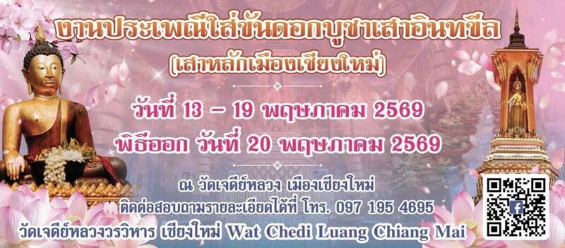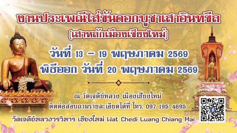 ขอเชิญชวนประชาชน รวมถึงนักท่องเที่ยวทั้งชาวไทยและชาวต่างชาติ ร่วมแต่งกายด้วยชุดพื้นเมือง หรือชุดผ้าไทยเข้าร่วมงานประเพณีใส่ขันดอกบูชาเสาอินทขีล (เสาหลักเมืองเชียงใหม่) ประจำปี 2569 ระหว่างวันที่ 13–19 พฤษภาคม 2569 ตั้งแต่เวลา 06.00–24.00 น. ของทุกวัน ณ วัดเจดีย์หลวงวรวิหาร อำเภอเมืองเชียงใหม่ จังหวัดเชียงใหม่