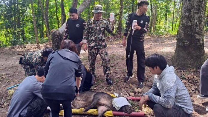 เมื่อถึงที่เกิดเหตุพบหมูป่าอยู่ในสภาพอ่อนแรงอย่างมาก แผลบริเวณที่ติดบ่วงมีอาการบวมและอักเสบ ทีมแพทย์ต้องตัดสินใจยิงยาสลบเพื่อความปลอดภัย ก่อนจะทำการปลดแร้วออก พร้อมให้น้ำเกลือและทำแผลเบื้องต้น ขณะนี้หมูป่าอยู่ในการดูแลอย่างใกล้ชิดตลอด 24 ชั่วโมง เพื่อรอให้สุขภาพแข็งแรงก่อนปล่อยคืนสู่ธรรมชาติต่อไป