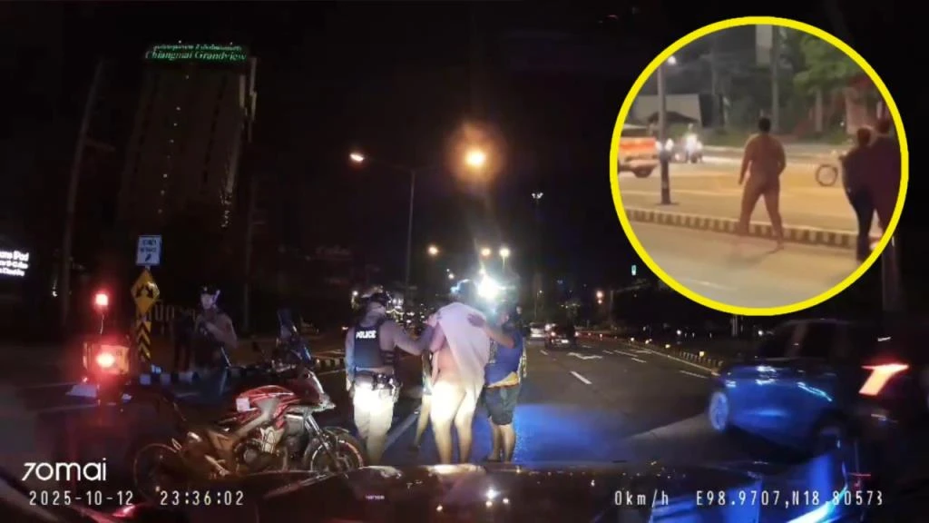 รายงานข่าวแจ้งว่าช่วงดึกคืนวานนี้(12ต.ค.68) พบผู้ชายรูปร่างใหญ่ไม่สวมใส่เสื้อผ้าแม้แต่ชิ้นเดียว เดินอยู่บนถนนซุปเปอร์ไฮเวย์ใกล้สี่แยกรินคำ มุ่งหน้าข้ามแยกไปยังถนนนิมมานเหมินทร์ ในตัวเมืองเชียงใหม่ ซึ่งสร้างความแตกตื่นตกใจให้กับประชาชนที่พบเห็นและมีการบันทึกภาพเหตุการณ์เอาไว้ พร้อมทั้งมีการแจ้งเจ้าหน้าที่ตำรวจและเจ้าหน้าที่กู้ภัยกตัญญูธรรมกุศล ให้เข้าตรวจสอบ