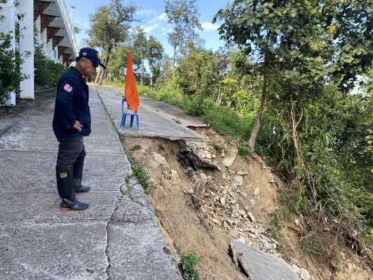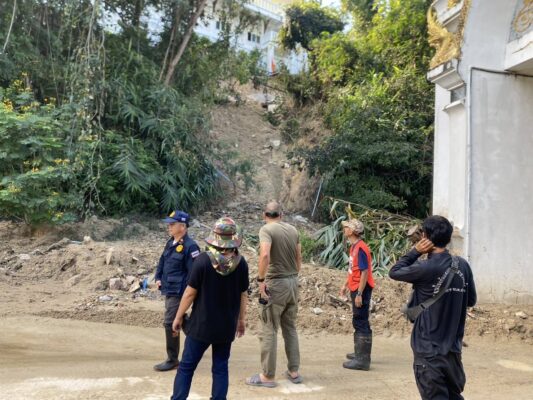 เมื่อวานนี้ (14 พ.ย. 68) เวลา 13.30 น. ที่วัดพระธาตุดอยเกิ้ง ต.ท่าเดื่อ อ.ดอยเต่า จ.เชียงใหม่ นายธนภัทร รัตนสมัย ปลัดอำเภอหัวหน้ากลุ่มงานบริหารงานปกครอง รักษาราชการแทน นายอำเภอดอยเต่า/ผู้อำนวยการอำเภอ ได้มอบหมายให้ ปลัดอำเภอฝ่ายความมั่นคง และสมาชิก อส. ร้อย.อส.อ.ดอยเต่า 18 บูรณาการร่วมกับ กำนัน ต.ท่าเดื่อ และงาน ปภ. อบต.ท่าเดื่อ ลงพื้นที่ตรวจสอบเหตุการณ์ดินโคลนสไลด์บริเวณวัดพระธาตุดอยเกิ้ง บ้านหนองบัวคำ ตำบลท่าเดื่อ อำเภอดอยเต่า จังหวัดเชียงใหม่