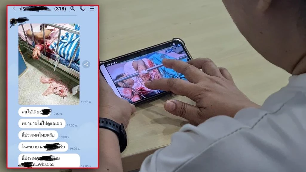 ซึ่งภาพที่เห็นคือผู้ป่วยหญิง สูงอายุนอนอยู่บนเตียงผู้ป่วยในโรงพยาบาลและมีเลือดไหลเปรอะเปื้อนจำนวนมากบริเวณเตียงและหยดลงพื้น พร้อมระบุว่า คนไข้เตียง… พยาบาลไม่ไปดูแลเลย นี้ประเทศไทย โรงพยาบาล…