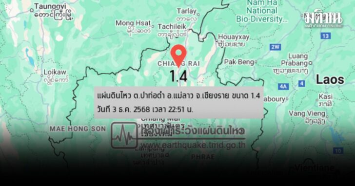 เมื่อวันที่ 4 ธันวาคม กองเฝ้าระวังแผ่นดินไหว กรมอุตุนิยมวิทยา ประกาศแจ้งเตือนแผ่นดินไหว ที่ จ.เชียงราย เมื่อเวลา 22.51 น. วันที่ 3 ธันวาคม (ตามเวลาประเทศไทย) บริเวณศูนย์กลาง ต.ป่าก่อดำ อ.แม่ลาว จ.เชียงราย ขนาด 1.4 จุดศูนย์กลาง 19.785°N , 99.723°E ความลึก 5 กิโลเมตร เบื้องต้นยังไม่มีรายงานความเสียหาย หากมีความคืบหน้าจะรายงานให้ทราบต่อไป